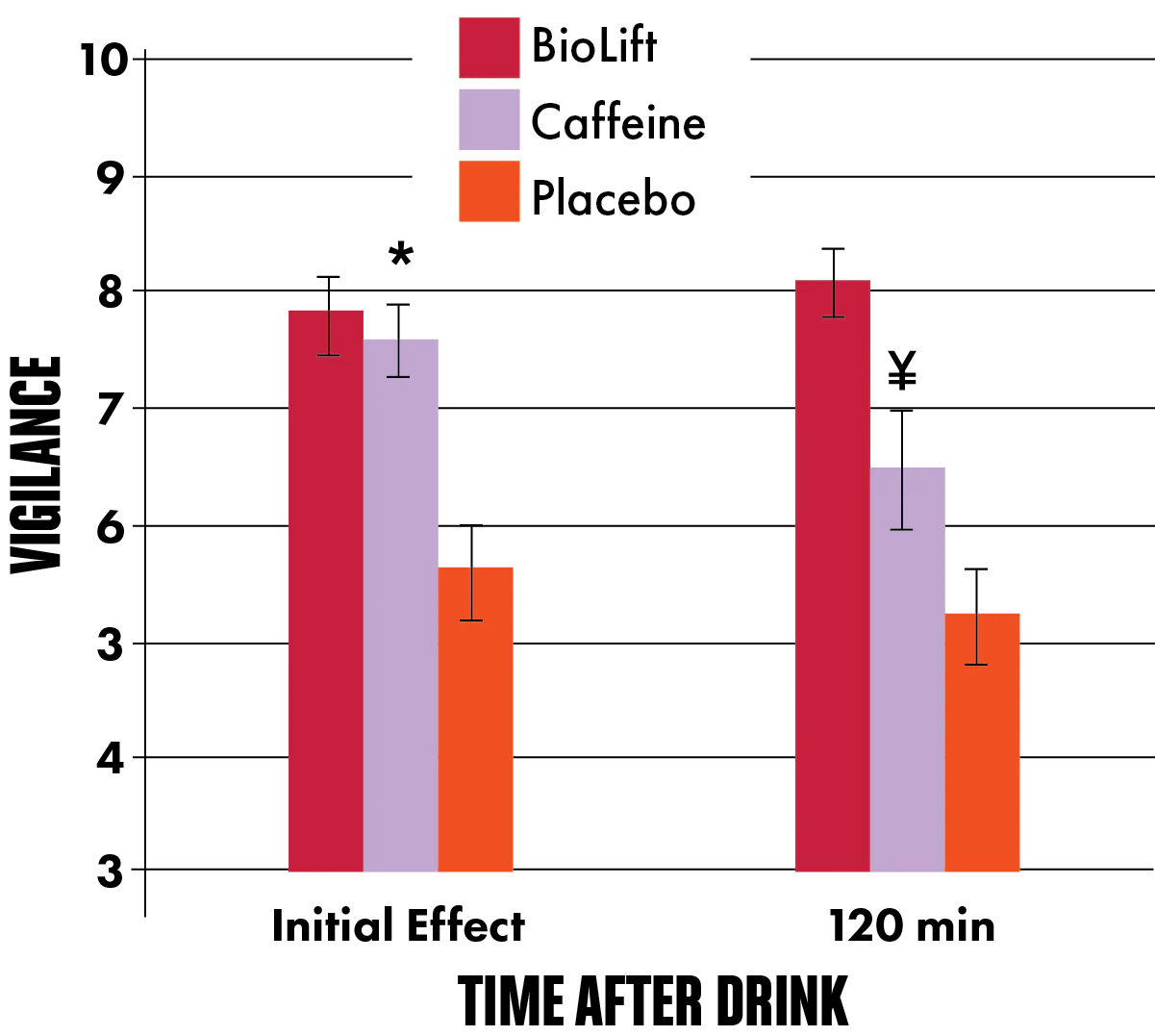 BioLift™ works without the increased fatigue side effect of coffee, whose awakening effect only lasts an hour.